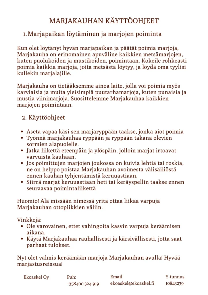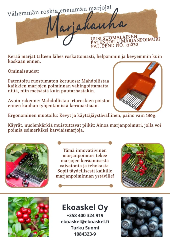 Eko Askel Oy on suomalainen yritys, joka valmistaa ekologisia, ekonomisia, ergonomisia kestäviä tuotteita. Uusin tuotteemme on marjanpoimuri Marjakauha, marjakauha on uusi Suomalainen patentoitu laadukas marjapoimuri.